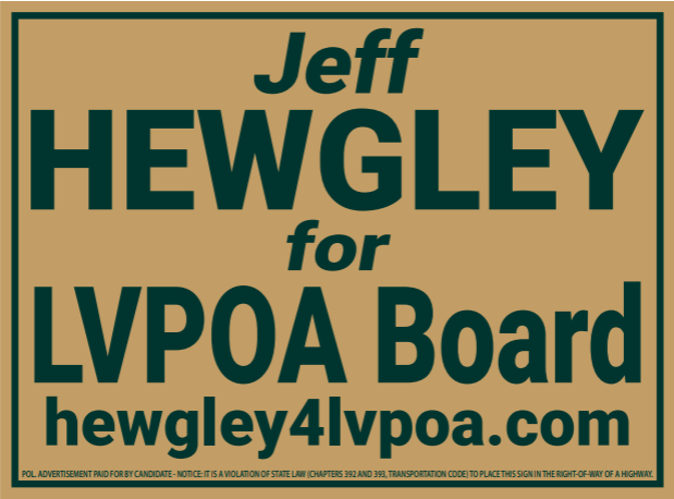 Put a sign in your yard. Subscribe to the Supporter Newsletter. Learn other ways to support Jeff Hewgley in securing a seat on the Lago Vista POA Board of Directors! Click below to learn more.